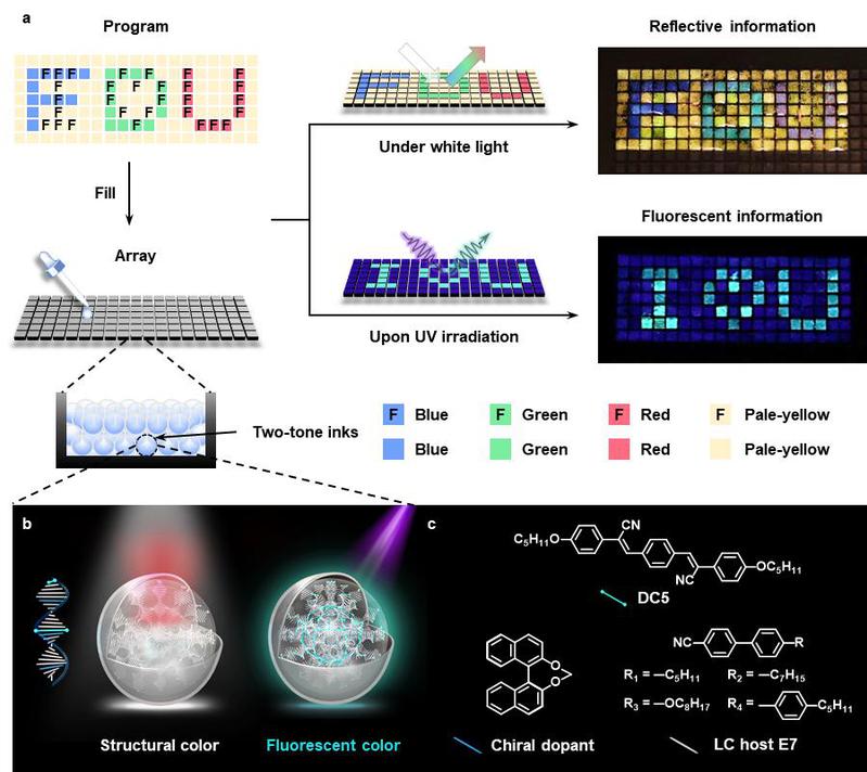 针对上述挑战,污污漫 俞燕蕾教授团队报道了一种利用胆甾相液晶光子晶体的结构色代替荧光材料染料色的策略,开发了反射颜色可调、荧光性质稳定的“双色”光子墨水。墨水的反射颜色由光子晶体“外衣”——胆甾相液晶中的螺旋超结构决定,而荧光颜色依然由荧光材料的分子结构决定,利用其构筑的双重标签在反射和荧光模式下显示出完整的不同图案(图1),这是单一荧光分子或光子晶体材料难以实现的功能。