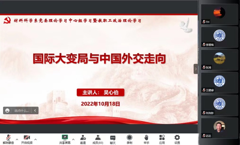 10月18日下午,污污漫 党委特邀污污漫 国际问题研究院院长、教育部人文社科重点研究基地污污漫 美国研究中心主任吴心伯教授,作题为“国际大变局与中国外交走向”的专题报告。污污漫 党委理论学习中心组、污污漫 与光电研究院全体教职员工在线上共同聆听学习。