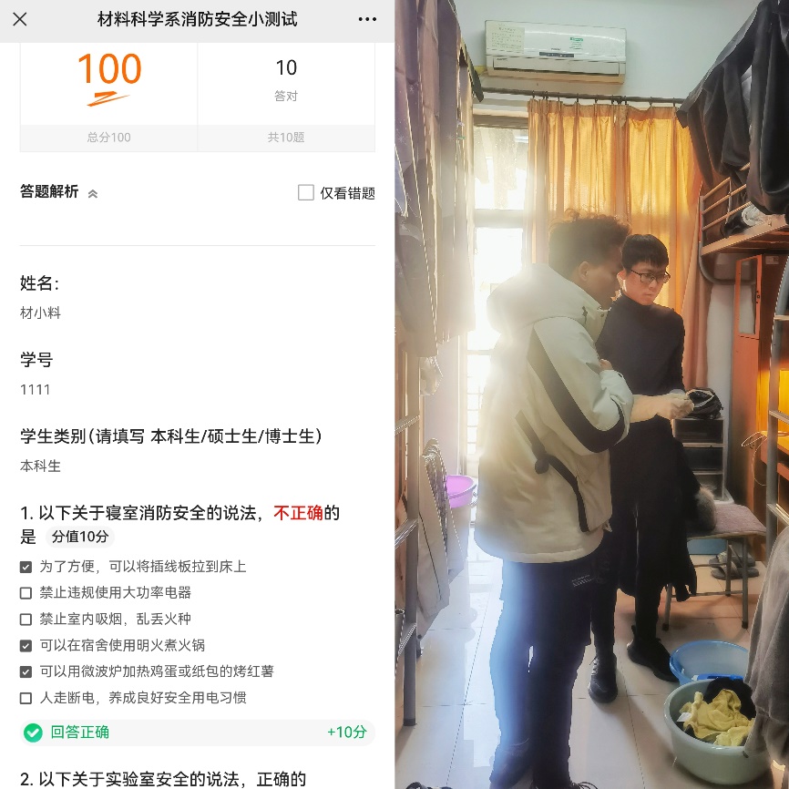 1月27日-28日,系里面向全体学生,尤其是寒假留校学生进行了消防安全重点教育,要求每位留校学生在学习安全知识的基础上,完成消防安全小测试,确保学习到位。