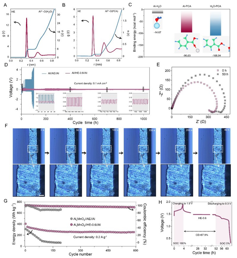 图2.(A-C)Al(OTf)3-PCA电解质体系的分子动力学模拟和从头计算研究。(D-F)基于HE-0.6电解液的Al//Al对称电池的电化学性能。(G和H)HE-0.6电解质的Al//AlxMnO2全电池的电化学性能。