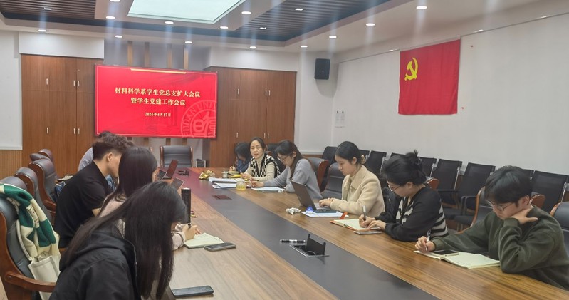 在江湾先进材料楼221会议室召开学生党总支扩大会议暨2024年春季学期学生党建工作会议。系党委书记于瀛、党委副书记许妍、学生党总支委员仝洁、学工组长刘佳锜、研工组长韩画宇及各学生党支部书记和骨干出席会议。会议由党委副书记许妍主持。