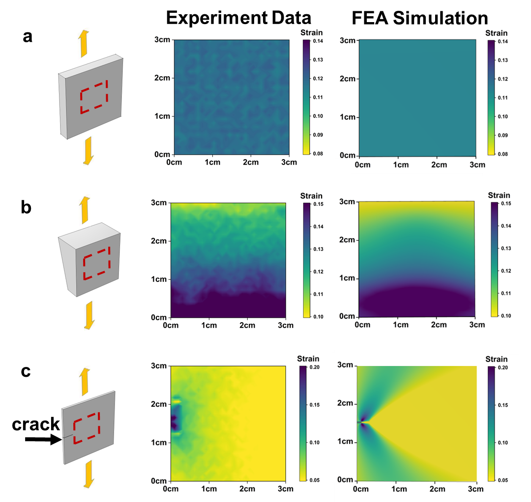 为了验证应变传感阵列薄膜测试被测物体应变的准确性,作者选择了均匀拉伸、梯度厚度拉伸、带裂纹拉伸三种情况进行了应变分布测试,并用有限元分析(FEA)进行对照验证。实验证明,该高分辨率的传感薄膜首次实现了对被测物裂纹尖端应变集中状态的精确测量。而利用进一步搭建的应变传感监测电路系统,可实现应变监测的可视化和实时信号处理,为工程应用提供了便捷。