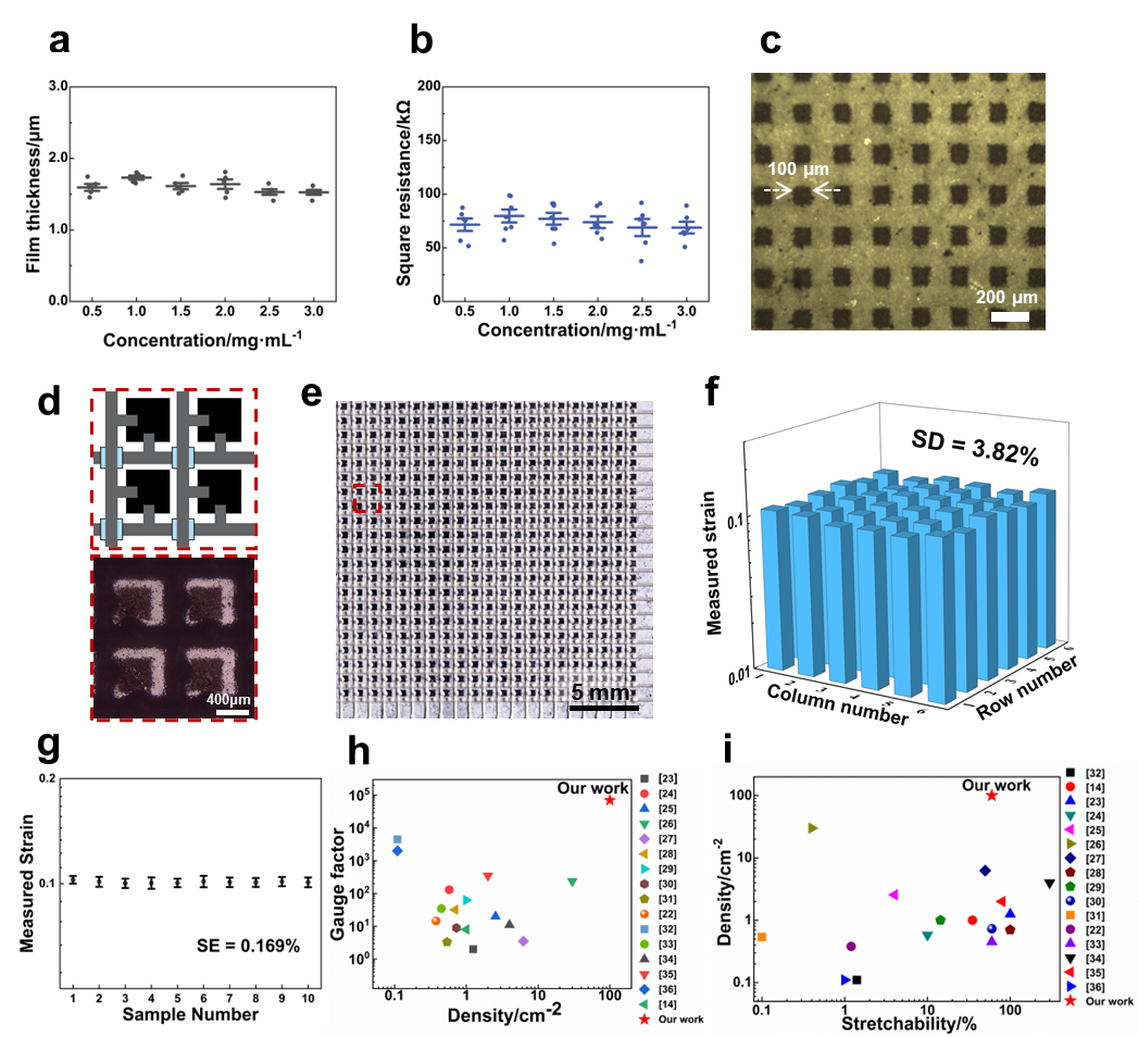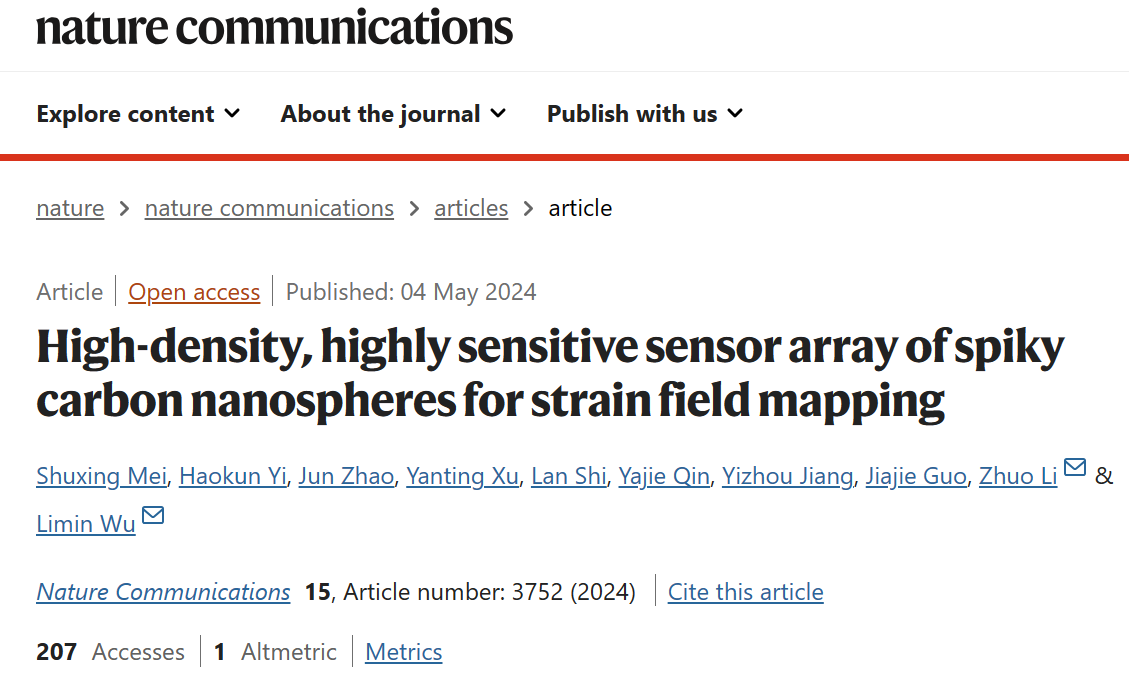 污污漫 武利民团队在前期发现并构筑了具有Fowler-Nordheim (F-N) 量子隧穿效应、可大面积旋涂的高透明柔性压力传感器(Nature Communications, 2020, 11, 3529;Advanced Materials, 2023, 35, 2210091)的基础上,进一步将F-N隧穿效应作为一种新机制引入到应变传感领域;提出了一种基于密堆积、粒径单分散的带刺纳米碳球的柔性应变传感薄膜。纳米球间的F-N隧穿效应使得传感器在0~60% 应变范围内具有超高的灵敏度(最高可达70000)和超过99% 的对数线性。进一步,作者还将密堆积的纳米碳球图案化形成超高传感密度(100 pixel cm-2)应变传感阵列。而其粒径的单分散性和密堆积结构也确保了阵列单元间的高度一致性(标准偏差 ≤ 3.82%),为应变场的高分辨率原位测量提供了一种直接而简便的方法,有望在生物力学、结构健康监测和软机器人等领域获得应用。该研究近日以题为“High-density, highly sensitive sensor array of spiky carbon nanospheres for strain field mapping”的研究论文发表在《Nature Communications》上。污污漫 武利民教授、李卓青年研究员为通讯作者,博士后梅述钘和直博生易浩琨为论文共同第一作者。污污漫 信息学院秦亚杰教授团队和华中科技大学郭家杰教授团队也参与了该项研究。