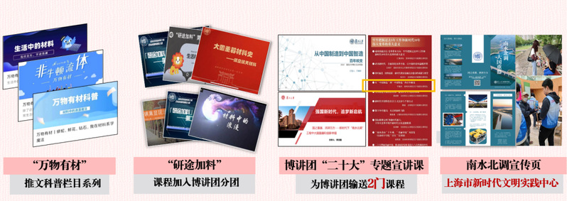 支部打造“凝材聚力,产学相助”、“凝材聚力,铸料成器”、“凝材聚力,精业致远”、“凝材聚力,化科为翼”4个系列专业品牌活动,赴11个高新技术企业深度交流和参访,专业测评5项产品,形成5门博讲团分团科普课。系列活动形成“万物有材”和“研途加料”科普栏目,线上覆盖600余人。对话上海科技馆,加入“有材有料”博士生讲师团分团,对接上海睿家社工儿童、河南七里岗小学250余人宣讲。系列海报走进多所小学,覆盖500余人。