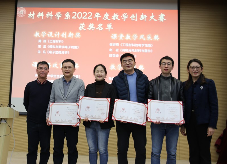 在致谢与表彰环节,于瀛代表系党委向2022年疫情防控工作中主动进校值守的教师们致谢,同时对全系教师2022年勠力同心、共谋发展表示了感谢。蒋益明宣读了2022年教学创新大赛获奖名单,于瀛、俞燕蕾为获奖青年教师颁发荣誉证书,并籍此鼓励全体教师要在党的二十大精神指引下,将“以中国式现代化全面推进中华民族伟大复兴”的思想融入课堂,结合材料学科专业特色与国际科技发展前沿,创新教学方式方法,为国家培养时代新人,支撑科技自立自强。