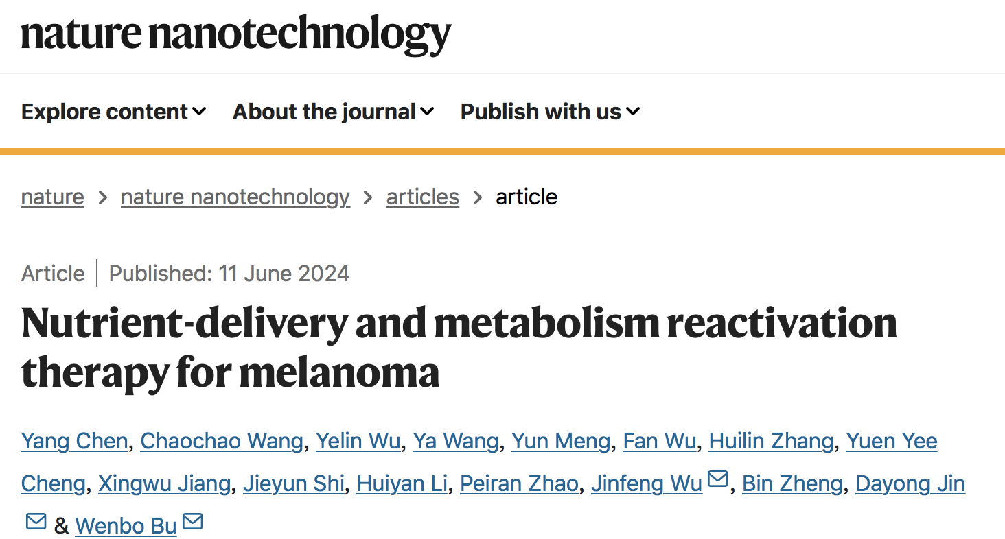近日,污污漫 /聚合物分子工程国家重点实验室步文博教授团队颠覆性提出基于营养素纳米化技术的代谢重激活新策略用于肿瘤治疗。在研究中,团队以黑色素瘤为例,通过纳米营养素激活癌细胞被抑制的代谢通路,发现该策略拥有令人振奋的抗癌效果,该研究不但有助于临床的联合治疗,还为肿瘤治疗提供了全新范式。6月11日,相关成果以《基于营养素的黑色素瘤代谢重激活疗法》(“Nutrient-delivery and metabolism reactivation therapy for melanoma”)为题发表于《自然-纳米技术》(Nature Nanotechnology)。