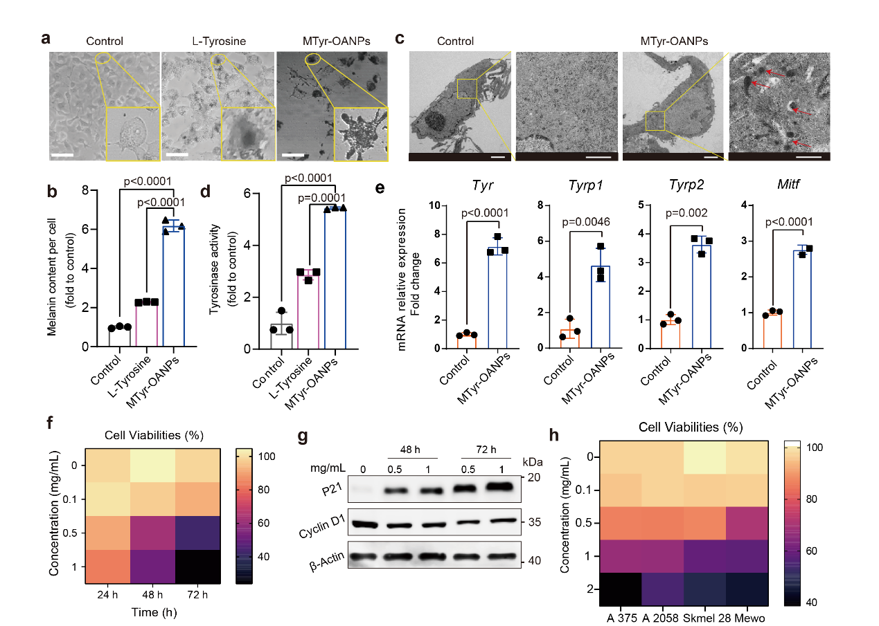 图3. MTyr-OANPs 促进黑色素生成并抑制黑色素瘤细胞生长