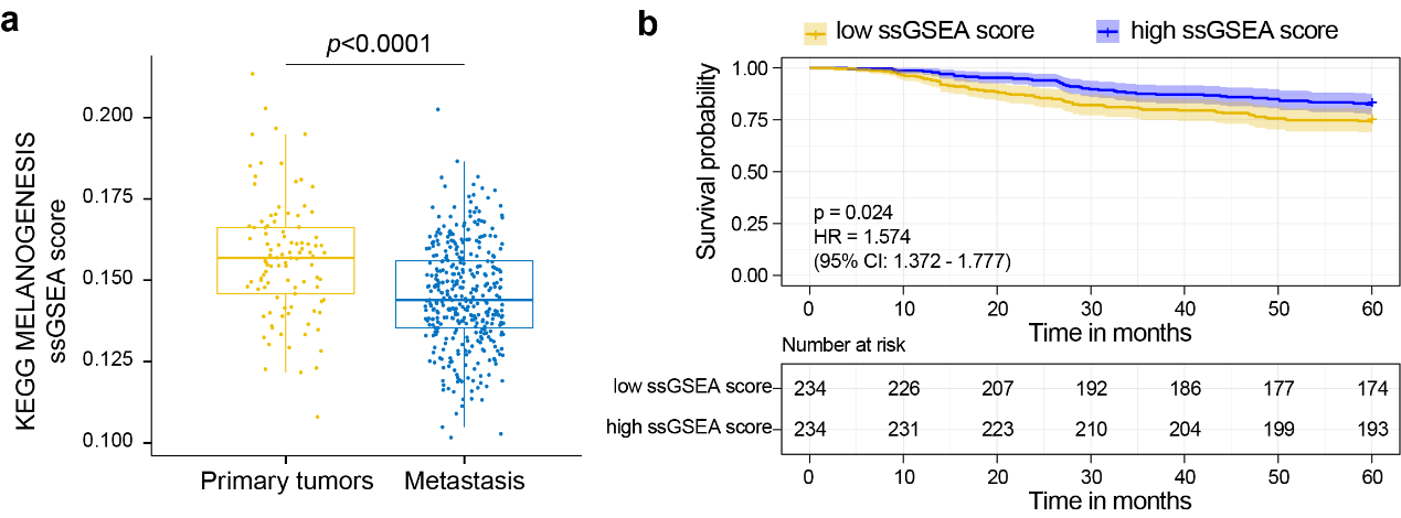 图1. 黑色素合成代谢在SKCM 原发性和转移性患者基因组富集分析中的得分(a)以及黑色素合成代谢与SKCM患者5 年生存率的关系(b)。
