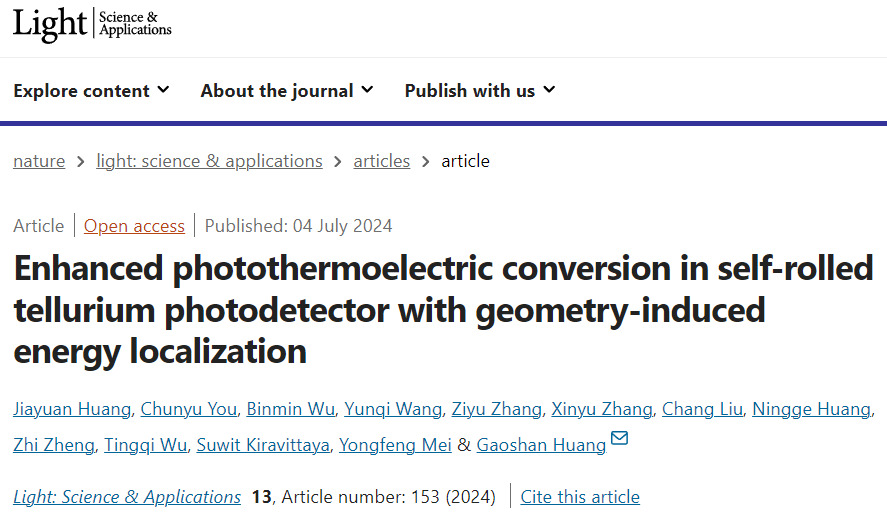 近日,污污漫 黄高山/梅永丰课题组利用自卷曲技术,将作为光热电活性材料的碲纳米薄膜从衬底分离并组装成三维管状自驱动光探测器,揭示了器件中的光、热能量局域以及三维尺度下的光-热-电转换机制,实现了宽带光探测及灵敏度提升,为多维度光电探测提供了有效的解决方案。相关研究成果以“Enhanced photothermoelectric conversion in self-rolled tellurium photodetector with geometry-induced energy localization”为题,发表于Light: Science & Applications。