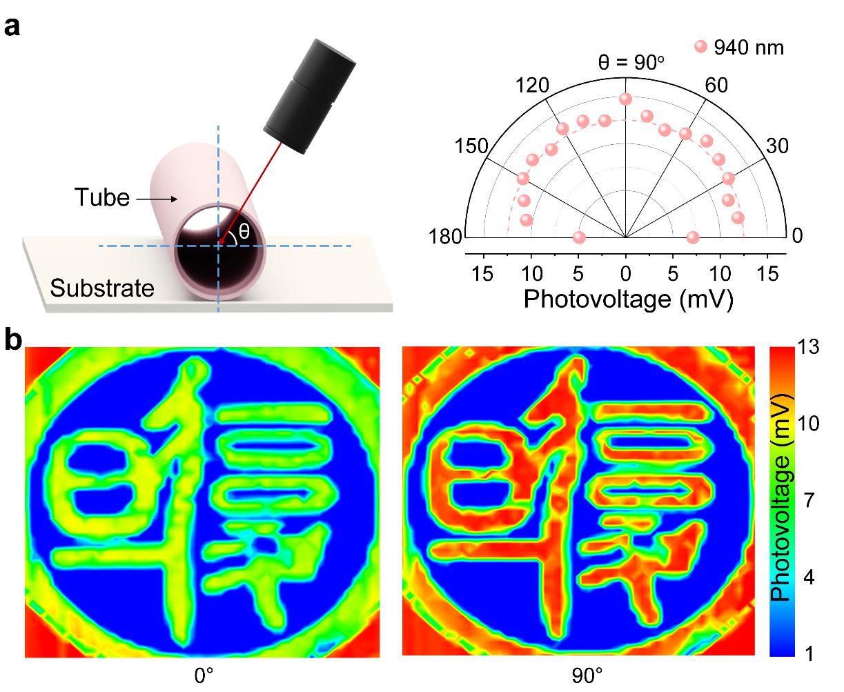 图3:自卷曲光热电探测器的全向探测与偏振成像:a. 卷曲探测器的广角探测能力示意图及角度分辨的光生电压测试结果;b. 在偏振入射角为0°和90°情况下自卷曲器件的成像结果。