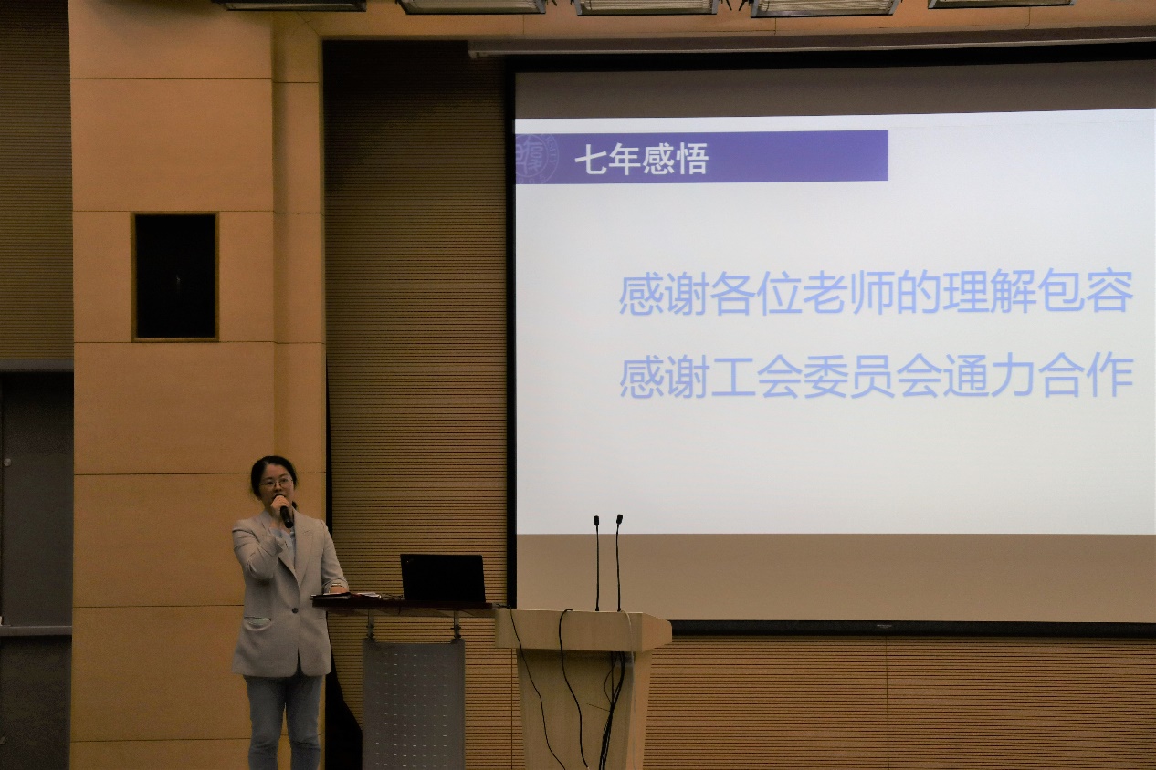 工会第八届委员会主席宋云首先代表上一届工会作工作报告和财务报告。她全面回顾了2016年至今,工会在系党委的坚强领导下,在推动院系事业发展、关注青年教师成长、构筑服务保障体系等方面取得的成绩,并对全体工会会员多年来的支持和帮助表示感谢,而在座的工会会员们看到照片里一张张鲜活的面孔时也将思绪拉回了一个个难忘的瞬间,感慨万千。
