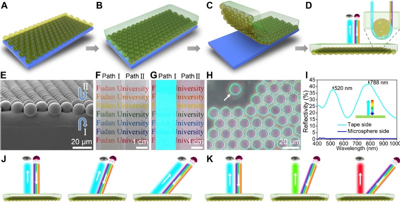 图1. 逆反射结构色薄膜的(A-D)制备步骤, (E-I)结构和光学特性,以及(J)照明/观察同轴时随角不变色和(K)照明/观察不同轴时随角变色的示意图