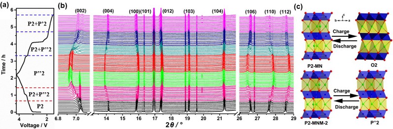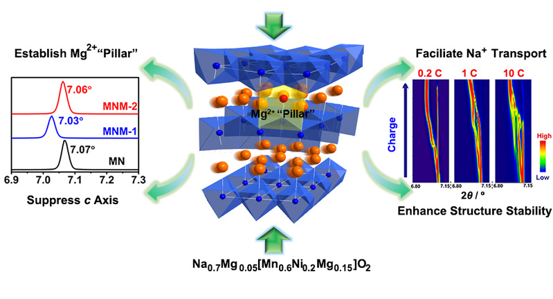 针对以上问题,周永宁课题组成功将Mg2+引入到P2-Na0.7[Mn0.6Ni0.4]O2正极材料的钠层中。由于Mg2+离子半径更小,且带有更多的正电荷,Mg2+的引入既打破了钠离子和空位的有序排列,又有效稳定了充放电过程中钠层的层间距,减缓钠离子嵌入和脱出过程造成的晶体结构变化,抑制了高电压充电时的不可逆相变。从而使得充放电曲线更加平滑,循环可逆性更高。他们运用同步辐射X射线原位衍射谱(XRD)和吸收谱(XAS)技术,实时跟踪了该正极材料在充放电过程中的相变行为和电荷补偿机制。发现Mg2+的引入还改变了其电化学反应机制,诱发了晶格氧的可逆氧化还原。此外,他们还利用同步辐射时间分辨原位XRD技术,在国际上首次揭示了快速充电过程中钠离子电池正极材料的相变行为。