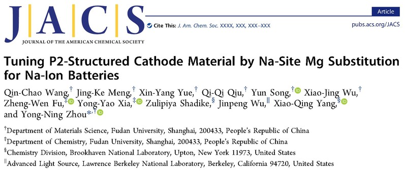 钠离子电池是目前储能领域的一个研究热点,它具有和锂离子电池相似的工作原理,钠离子也可以像锂离子一样,在正负极之间可逆地迁移,实现电能的存储与释放。由于钠元素在地球上储量极其丰富(比锂元素的储量高3个数量级),钠离子电池在低成本、大规模储能领域有巨大的应用潜力。然而,目前钠离子电池还处于实验室阶段,其电化学性能和商业化的锂离子电池相比还有很大差距,而正极材料是限制其性能的关键瓶颈。近日,我系周永宁课题组在钠离子电池正极材料设计和结构调控方面取得突破性进展,以《镁离子钠位取代调控钠离子电池P2型正极材料》(Tuning P2-Structured Cathode Material by Na-Site Mg Substitution for Na-Ion Batteries)为题在国际权威期刊《美国化学会志》(Journal of the American Chemical Society, JACS)(2019,DOI:10.1021/jacs.8b08638)上发表。