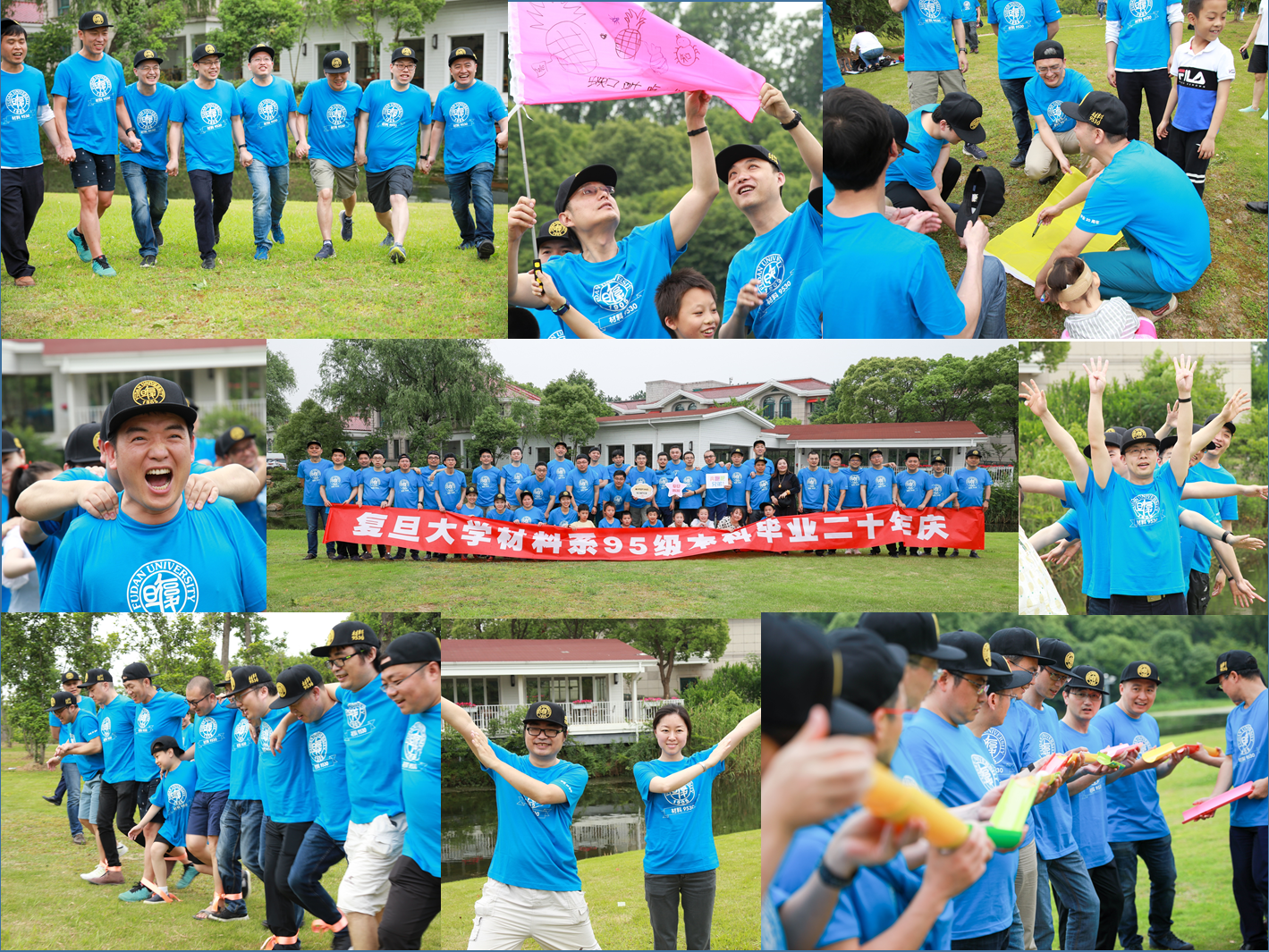 午餐后,大家迫不及待地开始了拓展活动,起队名、画队旗、想口号,闹得热火朝天;“齐头并进”“指压板跳绳”“珠行万里”,玩得不亦乐乎。拿着老照片,以几乎相同的姿态合影,数一数岁月留下的痕迹。天空下那张扬的笑脸,那恣意的笑声,那腾跃的身影,简简单单的游戏,将每一位同学的快乐都连接在了一起。