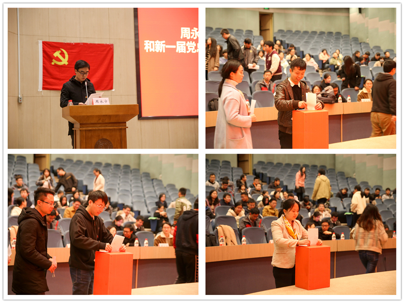 工作人员宣读大会选举方法(草案)和监票人、计票人名单(建议)后,大会表决通过了《中国共产党污污漫 学生党总支换届大会选举方法》和总监票人、监票人、计票人名单。经到会党员无记名差额投票,选举王珏、王剑中、仝洁、许妍、江乐、龚嶷、谢余凤(按姓氏笔划排序)等7人为新一届学生党总支委员。