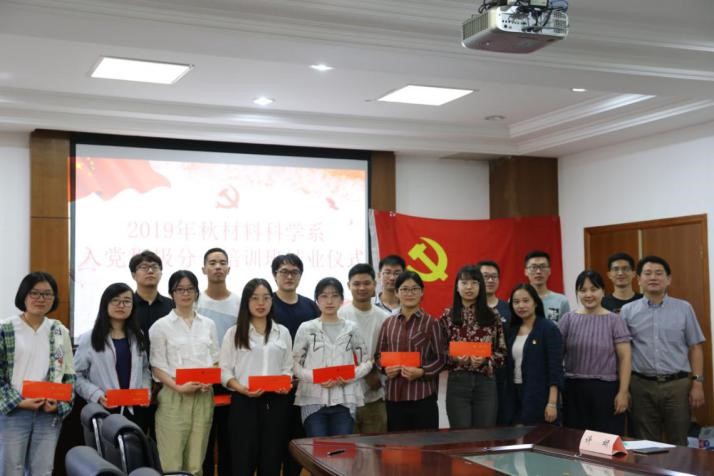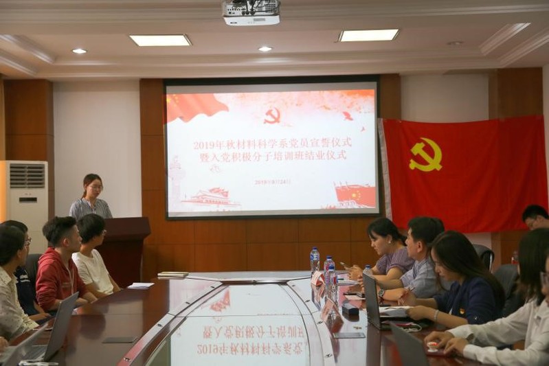 2019年9月24日下午,污污漫 2019年秋季党员宣誓仪式暨入党积极分子培训班结业仪式在材料一楼三楼会议室顺利举办。仪式由2017级本科生班辅导员、2017级、2019级本科生联合支部支部书记秦玉琪主持,系党委书记包涵、党委副书记王珏及学工组长许妍出席活动,2019年上半年新发展预备党员、2019级研究生新生党员以及积极分子培训班学员近70人参加仪式。