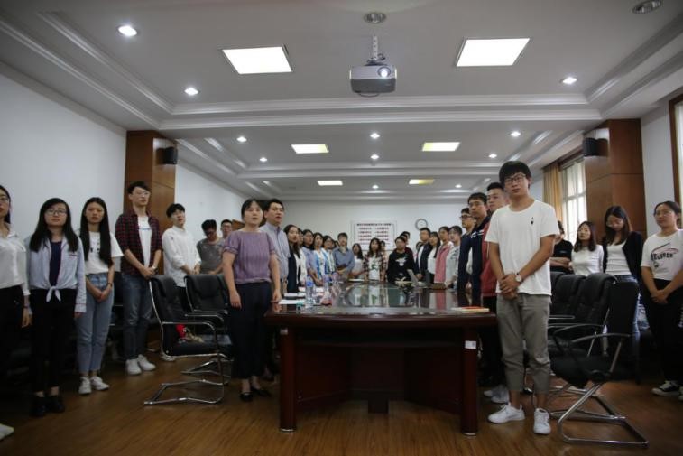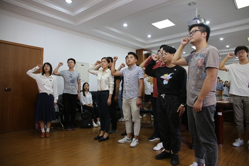 首先进行的是党员宣誓仪式。在奏唱国歌后,2019年上半年新发展预备党员、2019级新生党员面向党旗,举起右手,跟随领誓人2019级硕士生党支部书记江乐庄严宣誓。