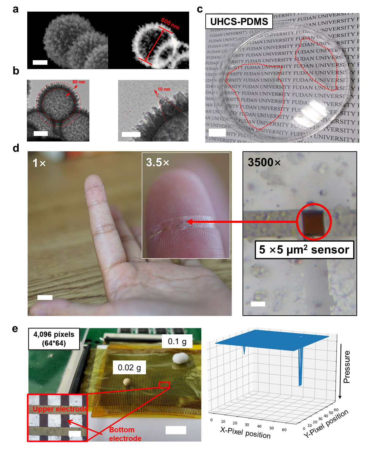 图1. a. 传感材料中所应用的功能微球扫描透射显微图像;b. 功能微球的透射电子显微图像;c. 红线圈中部分所示为制备的透明传感薄膜材料;d. 设置于人指尖的单点微型压力传感器,可轻松识别一片脱脂棉掉落指尖的动态压力过程;e. 高密度阵列演示中同时检测具有不同重量的两个微小物体(分子筛和小磁子)。