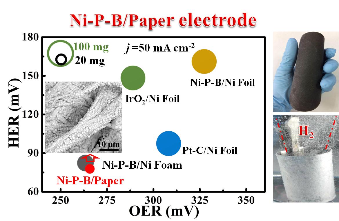 该工作使用常见、易得的基底材料(纸、海绵及布),借助简单的化学镀方法将导电催化剂均匀沉积于其表面,制备出了具有高效、经济、轻质、可折叠等特点的新型催化电极,所得电极具有良好的导电性,电极方块电阻只有0.42Ω sq−1。这类电极还具有优异的电催化活性,其中,使用滤纸构筑的Ni-P-B/Paper电极在1M碱性电解液中实现了高效的析氢(η500=276 mV)与析氧反应(η500=375 mV),并在1A/cm2大电流密度下可稳定工作240 h以上,性能优于相同催化材料的金属基底电极,而其重量仅为相同尺寸Ni Foil催化电极的五分之一,Ni Foam催化电极的一半。该工作具有潜在的实用价值,也为新型催化电极的设计与研制提供了新思路。