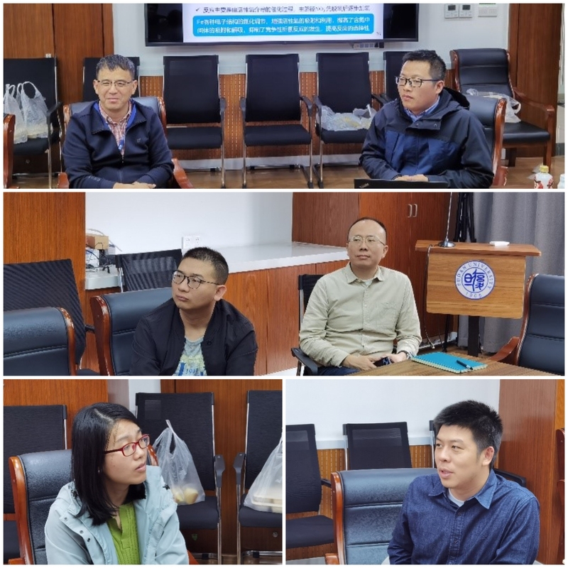 杨建平老师首先深入浅出地介绍了硝酸盐电催化还原对提升资源综合利用的重要意义。杨老师认为,各种人类活动通过向环境释放活性氮,造成了全球氮循环的不平衡。硝酸盐的释放是最有害的后果之一,因为它可以从土壤中浸出,污染地下水和地表水,从而导致富营养化和生态系统的扰乱。硝酸盐的转化或清除是一个重要的挑战,是恢复全球扰动的氮循环所必需的。随后,电催化还原是实现硝酸盐转化或清除的前沿技术,但其性能严重依赖于高效电催化还原催化剂的开发。随后,杨老师讲解了电催化还原催化剂的优化设计及相应的改性策略。互动环节中,杨建平老师与青年教师们开展了热烈的互动交流,为我系教师开展高效催化剂的前沿研究提供了指导和参考。