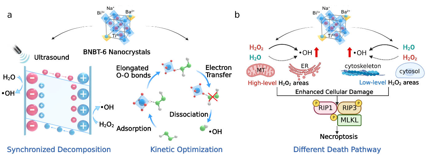 近日,污污漫 污污漫 /聚合物分子工程国家重点实验室步文博教授、污污漫 附属华东医院郑向鹏教授和同济大学附属第十人民医院吴叶林研究员的合作团队,创新性地提出了构建“非金属芬顿活性中心”用于肿瘤化学动力学疗法的新策略,为解决上述瓶颈问题提供了新的机遇。采用改进的皮其尼柠檬酸盐凝胶法,制备了一系列基于钙钛矿结构的钡元素掺杂钛酸铋钠(Bi0.5-xNa0.5BaxTiO3-0.5x,BNBT-X)压电纳米晶体,利用低价Ba2+取代Bi3+的受主掺杂技术,可在BNBT-X晶体内巧妙构筑氧空位缺陷。值得关注的是,带正电的氧空位可以增强电子局域富集作用,成为催化过氧键断裂的活性位点,即为“非金属芬顿活性中心”。首先,利用医用超声波可引起压力变化的特性,诱导BNBT-X的晶体结构发生变化,通过调控材料内部的极化状态而形成内建电场。继而,内建电场可推动材料内部电子(e-)和空穴(h+)的高效分离,其中,电子可以向H2O2的过氧键转移而生成OH(H2O2 + H+ + e-OH + H2O),提升材料催化分解H2O2生成OH的类芬顿反应活性,巧妙规避了高价态过渡金属还原为低价态这一经典芬顿反应过程的限速步;同时,分离的空穴可以氧化H2O生成OH(H2O + h+OH + H+),通过利用细胞内分布最为广泛的H2O作为OH的额外来源,解决了传统CDT纳米药物在癌细胞内低H2O2浓度区域产生OH效率低的瓶颈。实验结果表明,BNBT-6中构筑的氧空位可有效降低H2O2和H2O的解离能,赋予了材料在超声波激发下显著提升癌细胞全域内OH产率的能力,加剧了癌细胞的氧化应激,并可激活一种独特的细胞程序性死亡路径(坏死性凋亡),实现了对癌细胞的高效杀伤。