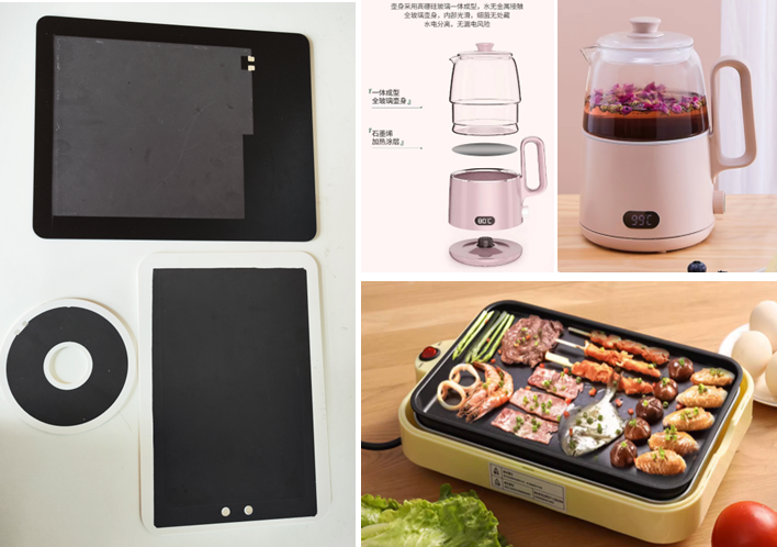 针对该关键技术问题,结合研究团队在光电功能涂料上的研究基础,研制了新型耐高温石墨烯电热膜,解决了石墨烯涂层在高温下的附着力、功率稳定性(350°C下)等问题。此外,结合绝缘涂层、电极连接技术、温控系统的开发。实现了石墨烯电热技术在电热水壶、电暖器、电饭锅、电烤炉、电热火锅等产品的高效应用。该系列家电产品,在此次工博会上进行展示,获得了很好的市场反响。