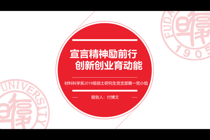 第一党小组以“宣言精神励前行,创新创业增动能”为题,结合多位复旦校友的创业事迹,分享宣言精神对当代创新创业的启示及指导意义。习近平总书记强调,学习马克思主义基本理论是共产党人的必修课。付博文从“大众创业、万众创新”的大背景出发,论述《共产党宣言》不仅指出了发展经济、解放生产力的重要性,还科学预见了经济全球化趋势,启发创业者在国际市场中审时度势,并提醒其在创新创业中始终将人民需求和社会需要放在首位。