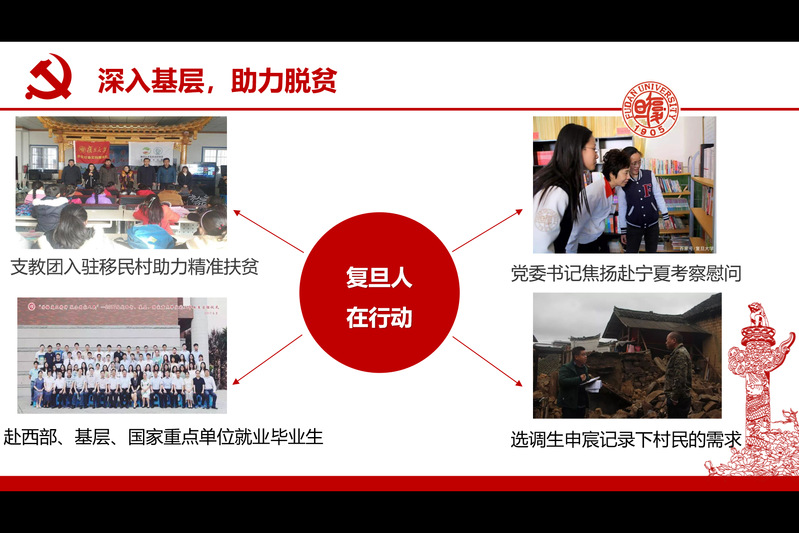 第三党小组以“宣言精神励前行,青春力量助扶贫”为主题,讲述了复旦人传承宣言精神、深入基层助力脱贫的故事。2020年是全面打赢脱贫攻坚战的收官之年,贾程棋分享了基层就业代表周峰、张斌、董永进、尚权正等校友前辈在脱贫攻坚一线奋斗的故事,以实例感召大家设立目标和志向,树立正确的价值观。青年的命运和国家紧密相连,新时代的大学生不仅需要了解和体会宣言精神,更要身体力行担当时代使命,努力为实现中华民族的伟大复兴不懈奋斗。