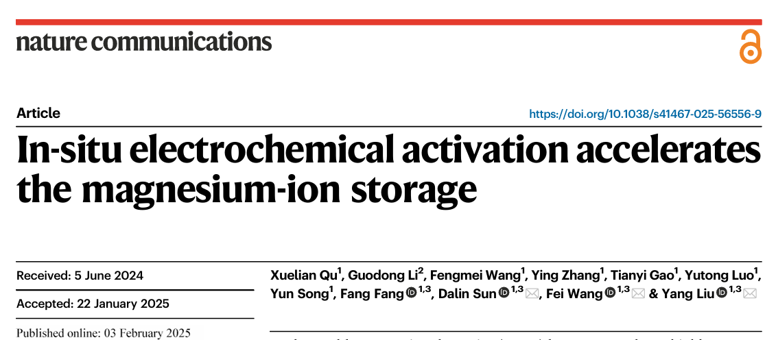 近日,我系孙大林、王飞、刘洋团队提出原位电化学活化(ISEA)策略,显著提高了CuSe正极材料的储镁动力学,实现了RMBs优异的循环稳定性和倍率性能。相关成果以“In-situ electrochemical activation accelerates the magnesium-ion storage”为题发表在Nature Communications期刊上。